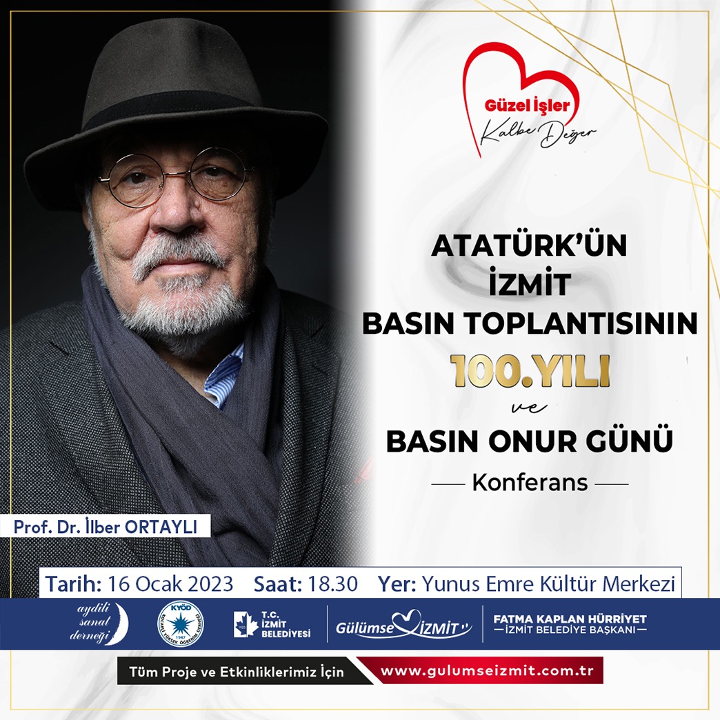 İzmit Belediyesi, Gazi Mustafa Kemal Atatürk’ün İzmit’e gelişinin ve ilk basın toplantısını düzenlemesinin 100. yıldönümü olan 16 Ocak Pazartesi günü gerçekleştirilecek söyleşide Prof. Dr. İlber Ortaylı ile İzmitlileri buluşturacak.