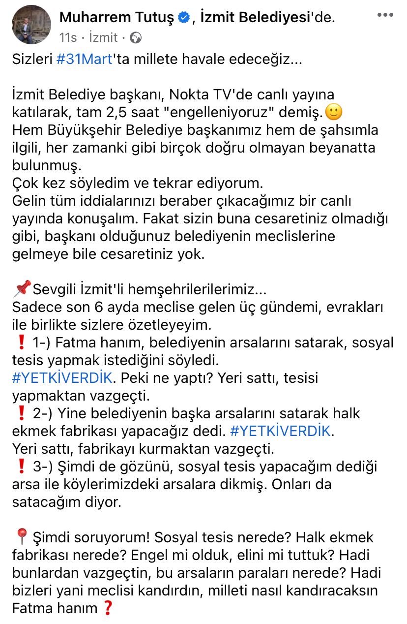 İzmit Belediye Başkanı Fatma Kaplan Hürriyet ,dün Nokta TV’de yayımlanan “Ebru Şimşek ile Şehirde Konuşulmayanlar” programına konuk oldu. Hürriyet’in açıklamalarının ardından İzmit Belediyesi AK Parti Başkan Aday Adayı Muharrem Tutuş, sosyal medya hesabı üzerinden yaptığı paylaşımla “Gelin tüm iddialarınızı beraber çıkacağımız bir canlı yayında konuşalım.” Çağrısında bulundu.